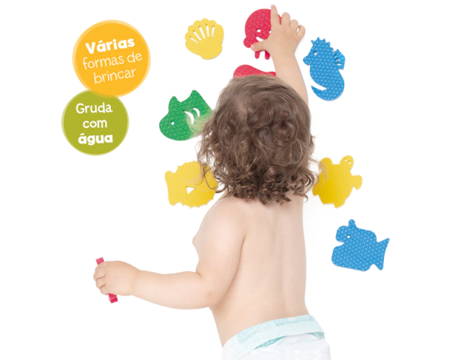 São dezesseis peças de espuma macia que, quando estão molhadas, grudam no azulejo. É uma forma divertida de conhecer os animais do fundo do mar.