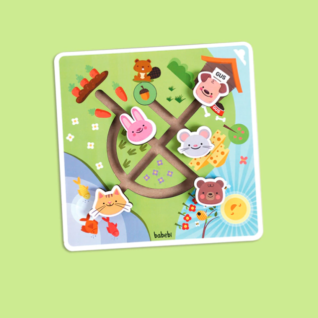 Contém 1 tabuleiro labirinto e 5 botões de animais do campo.
